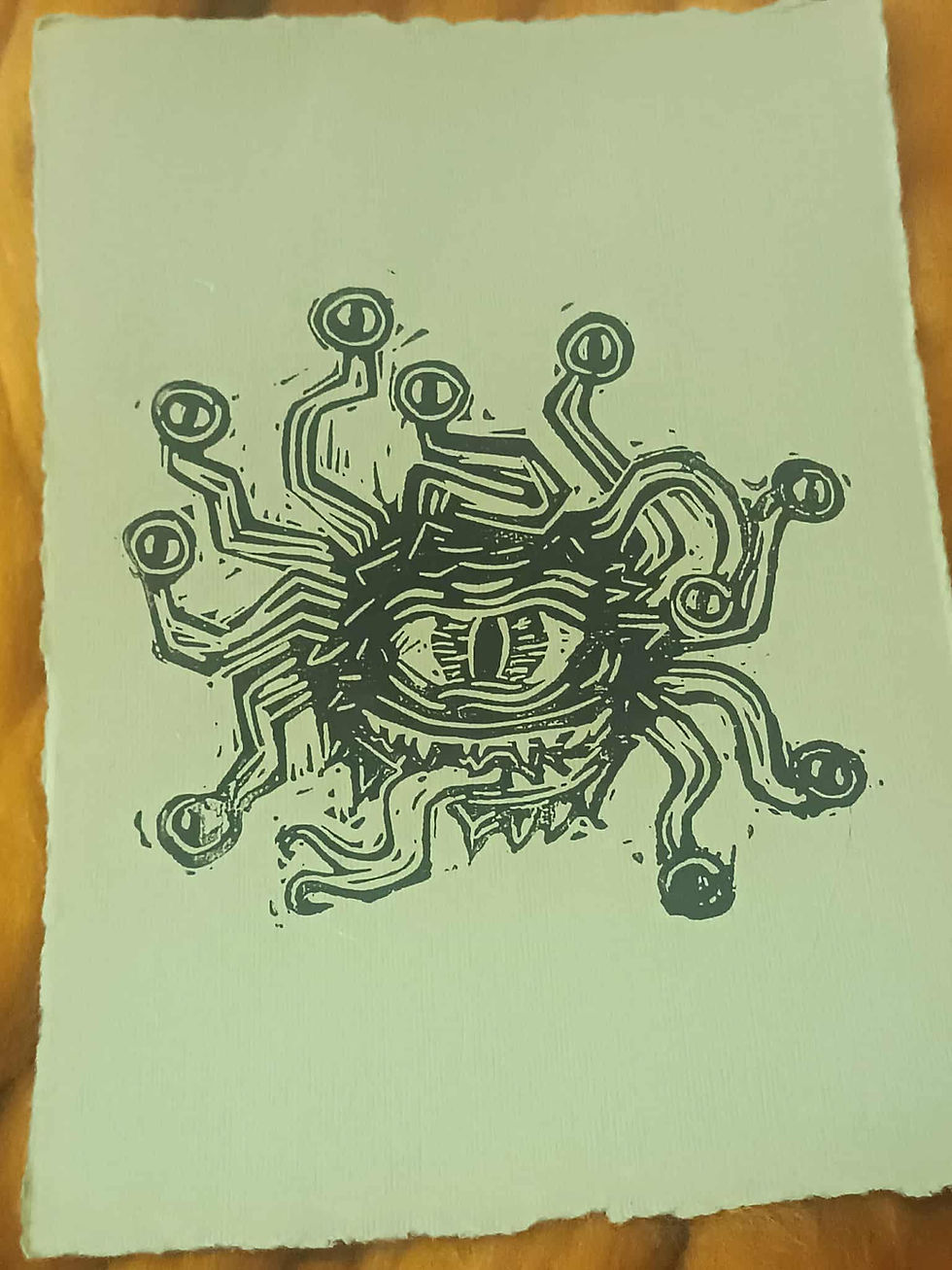 La linogravure est une technique d’impression en relief. Le motif est creusé dans une plaque de linoléum : les parties évidées restent blanches, tandis que les zones en relief, encrées, sont transférées sur le papier lors de l’impression réalisée à la main.